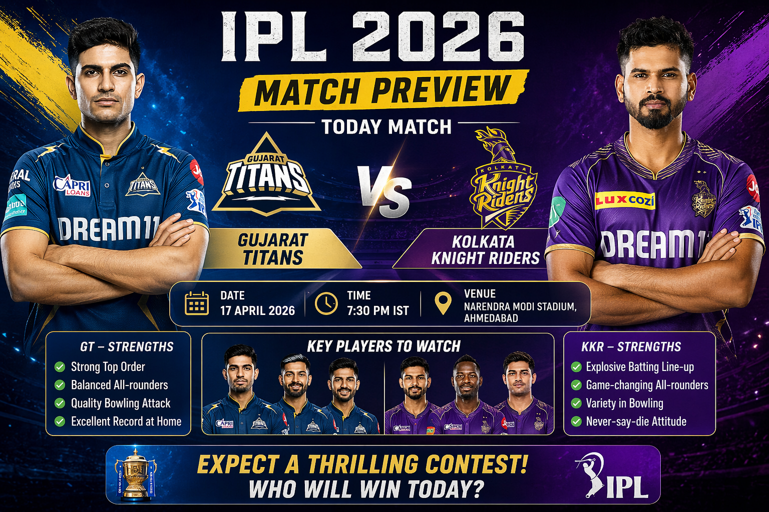 The Indian Premier League (IPL) continues to be one of the most electrifying cricket tournaments in the world, blending high-intensity competition with global entertainment appeal. As the 2026 season unfolds, each match carries significant weight—not just in terms of points, but also momentum, team morale, and playoff positioning. One such crucial encounter is the clash between the and the , scheduled for April 17, 2026, at the iconic Narendra Modi Stadium in Ahmedabad.